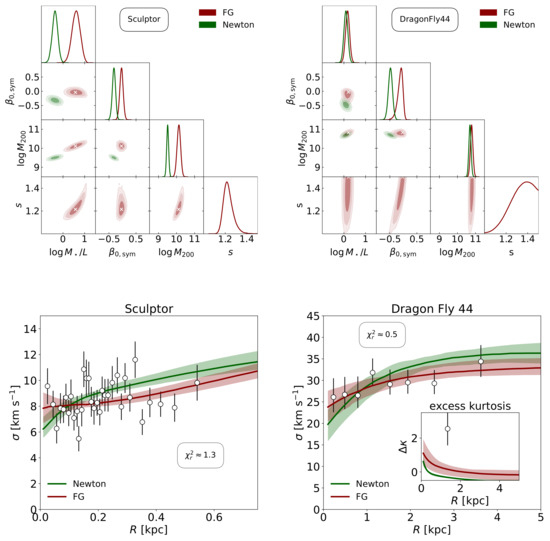 As can be seen in the top panel of Figure 4 for Sculptor and DragonFly 44, the most relevant degeneracy between the fitting parameters involves s and the , in such a way that FG models with larger s tend to be more isotropic. In fact, for Sculptor and DragonFly 44 the FG fit showed preference for almost isotropic orbits, while the Newtonian fit favored tangentially dominated motions. The bottom panel of the same Figure illustrates visually the quality of the FG fit for Sculptor and DragonFly 44, which was excellent within the scatter of the datapoints. FG performed definitively better than the Newtonian case for Sculptor, while for DragonFly 44 the evidence was rendered barely significant, in terms of reduced and of the BIC. In this respect, however, it is also interesting to look at the inset, where the excess kurtosis is illustrated (the kurtosis is related to the fourth velocity moments of the stellar tracers, and the excess is with respect to the value 3 for a reference Gaussian velocity distribution). Although the measured value was largely uncertain, there was clearly a tendency towards a definite positive ; qualitatively, this was consistent with the FG result at , while being highly discordant (more than ) with the Newtonian fit. It is worth mentioning that the estimated from our analysis in FG is consistent with the recent determination from the abundance of globular clusters in DragonFly 44 by [80].