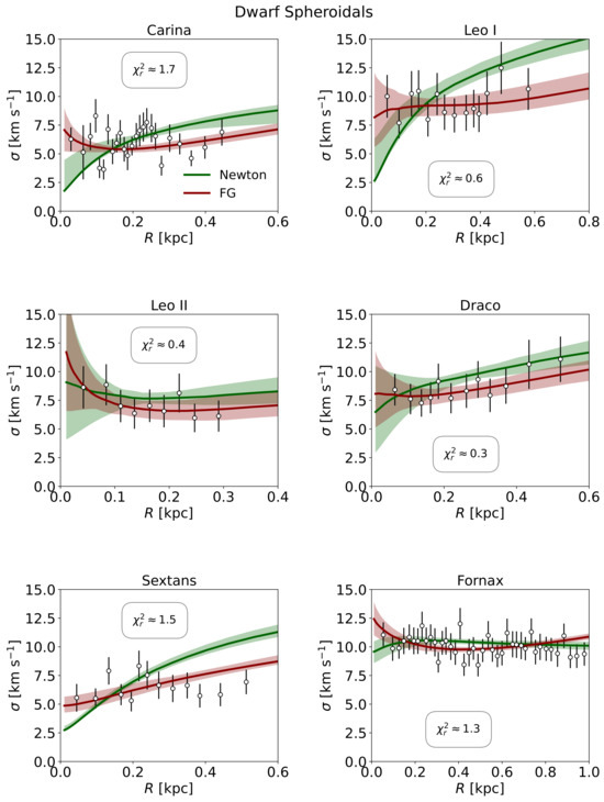 The FG fits to dispersion-dominated galaxies were very good, and in several instances appreciably better than in Newtonian gravity. In particular, for Carina, Leo I, Sculptor, and Sextans there was a clear preference for FG, both in terms of and in terms of the BIC. In such cases, the fractional index took on typical values , the stellar mass-to-light ratios were appreciably larger than for the Newtonian case and more in line with the prior from stellar population synthesis models, and the DM masses were substantially larger by several factors, with respect to the Newtonian fits. In other cases, namely Leo II and Draco, the index was smaller, the estimates of the fitting parameters in FG and in the Newtonian setting were consistent with , and the overall quality of the fits was comparable. Finally, in the cases of Fornax and DragonFly 44 there was a clear preference for large values of , but the improvement in the FG fits with respect to the Newtonian case, while clear on a visual inspection, was not statistically significant enough to make definite conclusions.