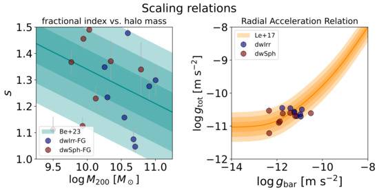 Finally, in Figure 6 we illustrate two interesting scaling relations that constitute relevant crosschecks of our results. The diagram on the left panel displays the fractional index s as a function of the DM mass . Apart from a few exceptions (objects with ), the values from our analysis of individual dwarf galaxies in FG are consistent to within with the expectation from the relationship by [45] that was derived from fitting stacked rotation curves of rotation-dominated galaxies.