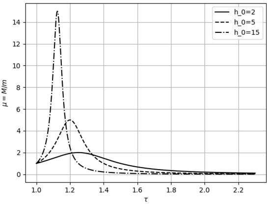 The function starts with the value m at t = t* then reaches the maximal value at the moment t = tmax= t+, and then it decreases monotonically. The time moment tmax= t+ is the function of the parameter h0 (see (83)); when h0 = m, tmax= t*; when m < h0 < 2m, this function grows and reaches the maximum at h0 = 2m; when h0 > 2m, the parameter tmax decreases and tends to t*. In other words, when the guiding parameter h0 monotonically grows, the maximum of the function drifts to the late time moments then stops and starts to drift to the initial point t*. Figure 1 illustrates the behavior of the reduced function for the cases when h0 ≥ 2.