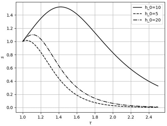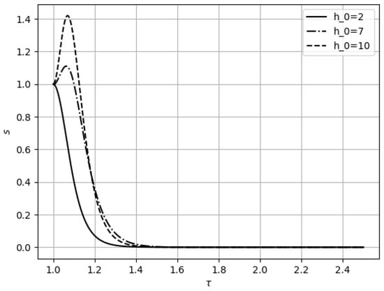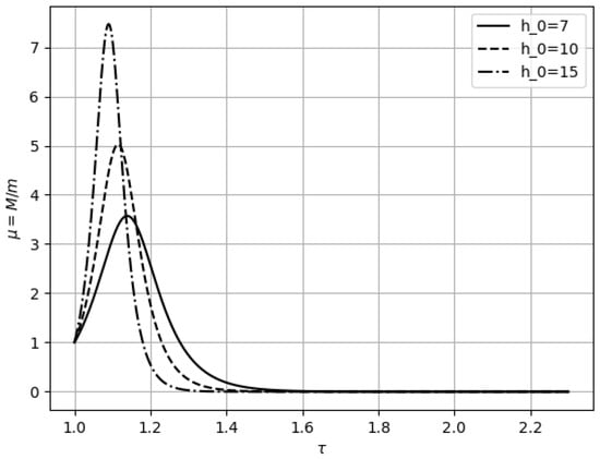 Illustration of the behavior of the dimensionless function for the model with (see (88)) when the parameters , , m, , are fixed and only the guiding parameter is varying. According to the legend, when grows, the maximum of the graph shifts to the late time moments then stops and starts to drift towards the initial time moment. The heights of the maxima of the graphs increase on the first stage and decrease on the second one.