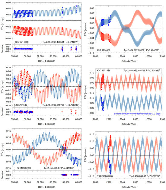 At this point, however, one should note an important caveat. As was mentioned above, our analysis has shown that this triple system is quite young, and its components (or, at least, the less massive ones) are most probably in pre-MS stages. Such components may potentially exhibit strong spot activity and may rotate non-synchronously (and perhaps even in a non-aligned way). Both effects can affect the ETV curves either indirectly, through the spot-induced light curve distortions, which may mimic rapid quasi-periodic and anticorrelated variations in the primary and secondary ETV curves [69,70,71], or directly, influencing the apsidal motion rate of the inner binary [72,73]. In the current situation, however, we are convinced that the peculiar behavior of the ETVs cannot be explained with these latter effects. First of all, in all the known cases, the time-scales of the quasi-periodic spot-induced variations range from a few days to a few months (see, again, the plots in [70,71]), and, moreover, their amplitudes do not exceed 5–10 min. Moreover, as these ETVs are virtual and caused only by light curve distortions, which affect the determinations of the mid-eclipse times, these distortions would appear in the residuals of our model light curves and, hence, may become directly detectable11. On the other hand, regarding the possibility of the non-synchronous rotation, this may actually affect the apsidal motion rate and hence the apsidal motion period but will not change the eccentricity of the inner pair. It is the latter that is the main source of that bump in the ETVs, which now looks evident in the TESS measured eclipse times of KIC 9714358.