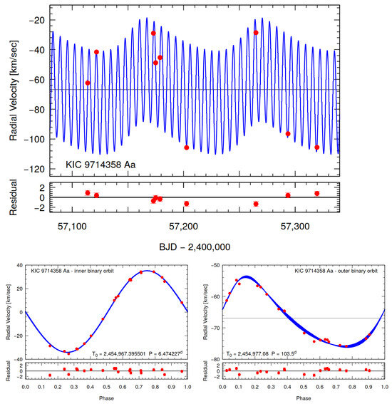 We have carried out complex photodynamical analyses of our three targets with our own software package Lightcurvefactory, developed by one of us (T. Borkovits, see, e.g., [59,60] and references therein). This code contains (i) a built-in numerical integrator to calculate the gravitationally (three-body effects), tidally, and (optionally) relativistically perturbed Jacobian coordinates and velocities of the three stars in the system; (ii) emulators for multiband light curves, ETV curves, and RV curves; (iii) built-in, tabulated PARSEC grids [52] for interpolating fundamental stellar parameters (e.g., radii and effective temperatures) as well as a composite SED model for the three stars; and (iv) an MCMC-based search routine for fitting the parameters. The latter applies our own implementation of the generic Metropolis–Hastings algorithm (see, e.g., [61]). The use of this software package and the consecutive steps of the entire analysis process have been previously explained in detail in several former papers (see, e.g., [59,60,62,63]). In this regard, we note that, despite the fact that Lightcurvefactory has a built-in subroutine for correcting the emulated light curves for finite cadence times (see [59] for the description of the process), due to the relatively long cadence times of 1800 s, we did not applied such corrections. This decision can be justified a posteriori by the fact that applying cadence time corrections in the case of KIC 9714358 resulted in parameters that remained within the domains of the uncorrected results (tabulated in Table 2)—even in the case of the most sensitive parameters (the inclinations). However, since the analysis runs with the cadence time corrections result in computation times about four-five times longer (on average), we declined to use this feature routinely.