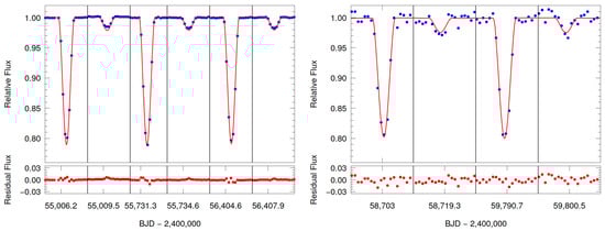 - Carter, J.A.; Fabrycky, D.C.; Ragozzine, D.; Holman, M.J.; Quinn, S.N.; Latham, D.W.; Buchhave, L.A.; Van Cleve, J.; Cochran, W.D.; Cote, M.T.; et al. KOI-126: A Triply Eclipsing Hierarchical Triple with Two Low-Mass Stars. Science 2011, 331, 562. [Google Scholar] [CrossRef]