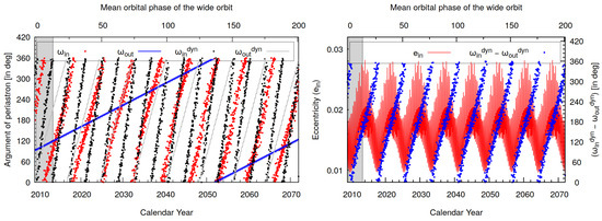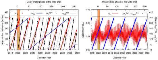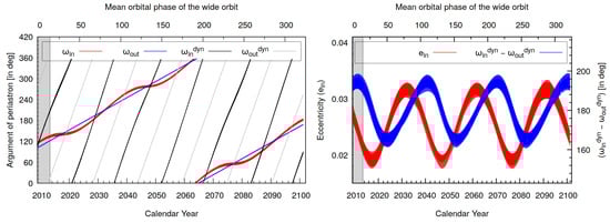The evolution of the orbits in KIC 9714358 from its discovery to the end of the current century. Left panel: The variations of the observable and the dynamical arguments of periastron of the inner and outer orbits ( and , respectively). Right panel: The cyclic variation of the inner eccentricity, and the very similar variations of the difference of the dynamical arguments of periastrons of the two orbits. The gray shaded area represents the interval of the Kepler observations. See text for further details.