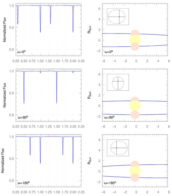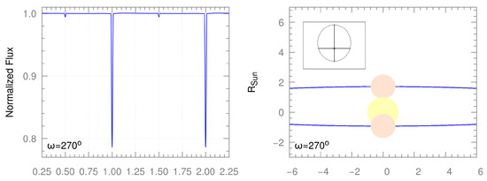 To understand the origin of this problem, one should keep in mind that for an eccentric () EB viewed not exactly edge-on (), the ratio of the eclipse depths, in addition to being a function of the ratio of the surface brightnesses, also depends strongly upon the position of the observable argument of periastron. This is so because, for the eclipse that occurs closer to periastron, the projected separation of the two stellar disks will be smaller than for the other kind of eclipse (closer to the apastron). Thus, a larger portion of the surface of the eclipsed star will be occulted. Naturally, the more eccentric the orbit, and the more grazing the eclipse, the more significant this effect may be. And, naturally, one can reach a situation where the eclipse closer to apastron disappears entirely, as was observed recently, e.g., in the case of KIC 5731312 [3]. Note, we graphically illustrate these effects for a hypothetical eccentric EB in Figure 7.