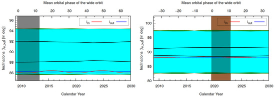 while the conjugate angular variables are the mean anomalies (), the dynamical arguments of pericenters (—or, traditionally, ), and the dynamical longitudes of the nodes (—or, ) of the inner and outer orbits, respectively. One should also keep in mind that, as was noted by Naoz et al. [36], although Equation (1) formally does not contain the nodes (), which would suggest the constancy of the conjugate variables , this arises only from an incorrect application of the elimination of the nodes. For a correct treatment, one should take it into account that, in the original Hamiltonian, both the inner and outer dynamical nodes are present but only through the sines and cosines of their differences, which is a constant and, therefore, , and . If one substitutes these values into the original Hamiltonian, it leads to the usual form of Equation (1). Hence, strictly speaking, from the simplified (Equation (1)) form of the Hamiltonian, the constancy of does not follow. This fact, however, does not affect the calculation of the perturbation equations of the other elements through the usual, formal way, and hence, in what follows, we do not take it into account.