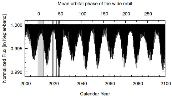 After the detrending processes, as a first step, we determined mid-eclipse times for each individual eclipse, in the very same manner as was described in Borkovits et al. [12]9. Then, preparing the dataset for the light curve analysis section of our complex photodynamical treatment, first, we binned the Year 4–5 data into 1800 s bins for a homogeneous sampling (not only with respect to Year 2 TESS data but also to the Kepler LC data). Then, in order to reduce computational costs and give higher statistical weight to the eclipses (which carry most of the relevant astrophysical and dynamical information amongst the light curve points), we dropped the larger parts of the out-of-eclipse light curves and kept only small light-curve sections around the primary and secondary eclipses.