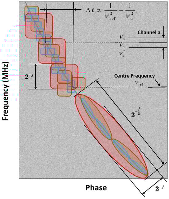 Assume that  has the property of “sparsity”, i.e.,  is N-sparse in a basis or a frame , such that  can be expressed by N non-zero coefficients in , i.e., , where  denote the coefficients under the sparse transform . In most cases, natural signals are not strictly sparse. Thus, the assumption of “sparsity” can be relaxed to “compressibility” if most of the energy in  is contained in its largest N coefficients. Wavelets have been successfully applied to the detection of isotropic features. For example, the isotropic undecimated wavelet transform (IUWT) or starlet [] has gained remarkable successes in galaxy images and has been proven to be well adapted to typical isotropic astronomical features in most cases []. Although two-dimensional (2D) wavelets can also be applied to the detection of curve-like features [,], being tensor products and separable extensions of 1D wavelet bases, they have a limited capability in isolating the directional information presented in natural signals. By contrast, shearlet [,] is specially designed to capture directional information of anisotropic features efficiently. Let  be the N-term shearlet approximation of , shearlet is theoretically optimal in representing piecewise smooth objects with the second-order continuously differentiable singularities (i.e., C-singularities) by an asymptotic approximation error , , which is close to the optimal rate . However, the approximation error for a wavelet representation decays by  as N increases. Although curvelet [,] also allows an optimal sparse representation for C curves and is the only other system known to satisfy similar approximation properties, it cannot form an affine system as the shearlet does. This is because curvelet is not obtained by applying dilations and translations to a single generating (or mother) function [], and the angle in its triple indexes is defined in polar coordinates. What motivates us are the above representation and approximation abilities of the sparse transforms well suited to specific radio features. Appendix A gives a short review for the construction of the shearlet. For detailed theories and applications of the wavelets and curvelet, one can refer to [,] and [,,], respectively. Figure 1 takes the dispersion relationship of a simulated pulsar signal as an example and gives a diagram to interpret the principles of sparse representation. The upper and lower halves of the signal are represented by the wavelet and shearlet, respectively. The squares and ellipses denote the spatial supports of wavelet and shearlet bases fitting the signal on different scales (from coarser to finer scales, the red, orange, and blue colors are used, respectively), where j is a scale,  and  are the lengths of the long and short axes of the spatial supports, respectively.