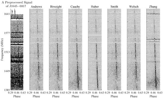 In the tests of pulsar signals, observations were made with the Nanshan 26-m Radio Telescope, which has a dual-channel cryogenic receiver with a reference frequency (or center frequency) of  = 1556 MHz. For practical observations, a broad band from 1300.5 to 1812 MHz with a total bandwidth of 512 MHz is applied. The digital filter bank is configured to  MHz channels and 8-bit sampling. Signal profiles of PSRs J1645−0317 (Figure 2), J1136+1551 (Figure 3), J0814+7429 (Figure 4), and J0332+5434 (Figure 5) are selected. They are folded data with 30 seconds integrated into one phase. All M-estimators applied in this test have already been shown in Table 1. Tuning parameters of the estimators are specified by their default values in Table 1. Unless otherwise specified, the following tests of FRB signals with wavelets and curvelet will always use this parameter setting. For pulsar signals with shearlet, the values of parameter q have been examined in repeated experiments for better SINR values. For J0332+5434, the Zhang estimator uses  and the others use . For other pulsar signals, the Huber one uses , and the other estimators apply . Empirically, the selected q of the methods make them work well. Generally speaking, the higher the q, the more RFI is removed. However, higher q will also lead to oversmoothed or excessively attenuated mitigation results, and valuable details for astrophysical purposes will be lost.