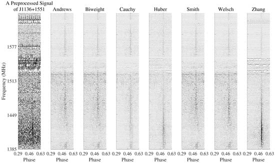 Generally speaking, by visual inspection of the four figures, one can see that among the M-estimators, the monotone ones (Huber and Zhang) show the best results, and the soft-redescending ones (Cauchy and Welsch) perform at a middle level. In the soft-redescending estimators, the Cauchy one has a performance close to those of the monotone ones, and the Welsch estimator performs similarly to the hard-redescending ones, which give relatively poor performances. Table 2 shows that the Huber estimator has the strongest robustness to RFI, and the trend reflected by the SINR values is consistent with that of the visual inspection. The Cauchy estimator performs well for pulsar signals with wider relative pulse widths in one phase (e.g., it has the best SINR values for PSRs J1136+1551 and J0814+7429). The proposed frameworks overcome the current defects in an obvious fact that most types of RFI have been removed for almost all the M-estimators in the applied pulsar signals.