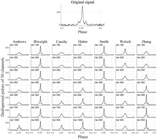 Figure 6 shows dedispersed pulses by the seven estimators for the processed profiles of J0332+5434. A randomly selected band containing 50 consecutive channels is dedispersed, and the channels are added up. The iteration numbers are also shown in each panel. By visual inspection throughout the panels, the monotone estimators, i.e., Huber and Zhang estimators, perform the best.