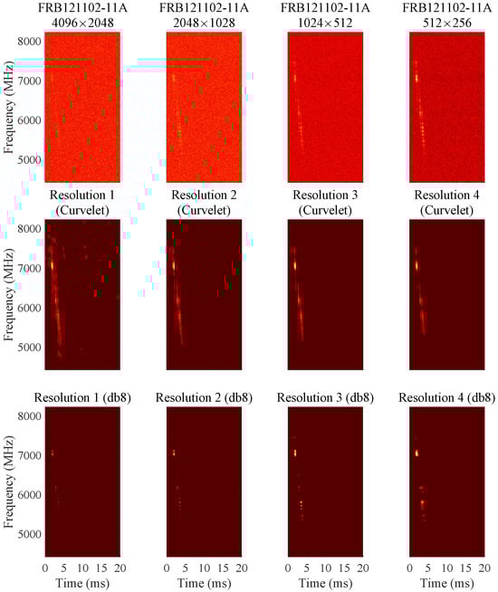 First, in Figure 7, a test is carried out for FRB 121102-11A to analyze the effect of different compromises between resolutions and SNR values on the mitigation results. This point is important because whether one prefers high resolutions or high SNR values should be decided by the specific detection tasks. The Huber estimator is applied in this test. By visual inspection, the curvelet can give prominence to the flux regions with anisotropic features caused by the downward drifting and scattering effect (middle). The overall contours of directional flux distributions of some burst components buried under RFI and GWN can be clearly identified. The 2D wavelet db8 (the vanishing moments order is 8) belonging to the family of Daubechies wavelets is taken as an example to provide multiscale characterizations for the isotropic flux regions (bottom).