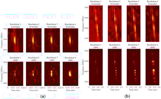 Zooming-in details of the dedispersed dynamic spectra of two portions of the signals in Figure 7 with the sparse transforms of curvelet (top rows of (a,b)) and db8 wavelet (bottom rows of (a,b)).