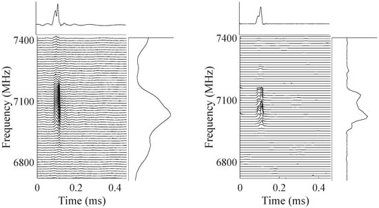 Figure 8 gives detailed scenes of the dedispersed dynamic spectra for two portions of the signals in Figure 7. By visual inspection, one can make analyses from two aspects, i.e., the isotropic and anisotropic distributed flux regions. For the isotropic flux, the bottom left of Figure 8a shows a processed result by db8 wavelet with a higher resolution, and one can see that the finer details can be extracted. From this result, a conclusion can be made that the flux centers of the two closest components (near 7000 MHz) can be completely separated without consideration of the surrounding anisotropic diffusing energy. The wavelet can also provide accurate sparse approximations for the isotropic subbursts. A trend of the subbursts of FRB 121102-11A in the frequency axis reveals that the higher the frequency, the more intense the changes in the varying subbursts in one component with smaller effects from the drifting and scattering. In the bottom left of Figure 8a, in high-frequency components with elliptic shapes affected by the downward frequency drifting, the superradiance can still be reflected in several narrow-band regions emitted at multiple descending frequencies and being very close to each other. This discovery benefits from the approximation ability of wavelets for isotropic features. The anisotropic flux mainly contains extensions in the time–frequency domain. The scattering effect, which gradually broadens the components, is obviously recognized and can be calculated for further astrophysical purposes, which will be our future work. The flux extensions of different components in the time–frequency domain can overlap with each other. Figure 9 also shows the dedispersed dynamic spectra of the two portions of FRB 121102-11A with resolution 2. The Huber estimator is applied. The clean curves given by the subpanels not only show the components but also clearly reflect the effects of scattering (top curves) and superradiance (right curves). Please note that the curves are only summed in the subpanel areas.