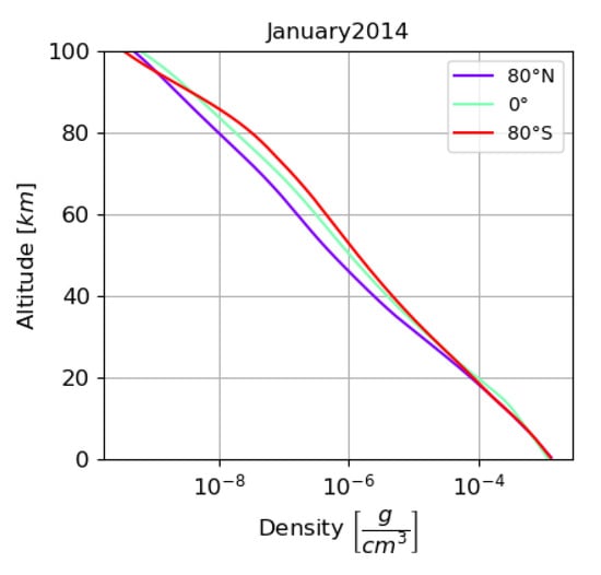 Further simulations were performed for equatorial and high latitude regions of both hemispheres (°) for every month of 2014. Figure 4a,b show the atmospheric density profiles computed with the NRLMSISE-00 model for each month of 2014 at high northern and southern latitudes, respectively. In this figure again, the exponential decrease in the density of the atmosphere with altitude remains at all times and in both hemispheres. The largest seasonal variations in atmospheric density occur at high altitudes in the atmosphere, between 90 km and 30 km in the northern hemisphere and from 90 km down to 20 km in the southern hemisphere. In this part of the atmosphere, the anti-phased variations in the density profiles at 80° N and 80° S where the maximum/minimum values of density are reached during the local summer/winter are stronger than below 20 km, where such variations are almost nonexistent.