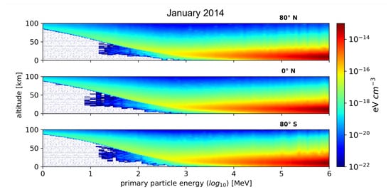 AtRIS calculates the average impact of a single primary particle with a given energy at different altitudes [28,29] by considering the effect of the primary particle, as well as the effect of all the resulting secondary particles (see [28] for further detail). The resulting matrices describe the relation between the primary particle energy and the altitude-dependent average ionization in the atmosphere. Thus, with this set up, for which the atmosphere is divided into three sub-atmospheres, three atmospheric response matrices (ARMs) were computed in a single simulation. Such atmospheric response matrices computed at 80° N, 0°, and 80° S are shown in Figure 2 from top to bottom, respectively. Note that such matrices only describe how much a particle (in this case, a proton) of a given energy (between 1 MeV and 1 TeV) contributes on average to the ionization of the atmosphere if it is able to reach the top of the atmosphere (TOA). At this point, the flux of primary particles as a function of their energy is not taken into account, nor is the effect of the geomagnetic field, so that the differences between these matrices is only due to changes in the atmospheric input of the simulations.