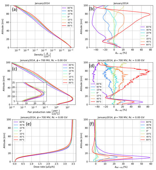 To investigate the effect of the latitude at which the input atmosphere is taken on the resulting ionization and dose rate profiles, we performed simulations at the equator, °, °, and °, so that low, mid, and high latitudes were taken into account. Figure 3 shows the computed ionization and absorbed dose rate profiles during the northern hemispheric winter of January 2014, as well as the atmospheric density profiles, which served as input for those computations. It is important to note that, since we only want to capture the effect of the input atmospheric profiles on the resulting ionization and dose profiles, the value of the modulation potential and the vertical cutoff rigidity are set to 700 MV and 0 GV, respectively, and are maintained constant in this section’s figures. The modulation potential value was chosen to represent the averaged value over 2014. According to the cosmic ray database, the results of which are based on work in [46], the averaged modulation potential over this year was 715 MV, which was rounded down to 700 MV because the maps presented further on in this research were only computed with a 100 MV resolution. Fixing the cutoff rigidity value to 0 GV, implies that the geomagnetic field influence on the TOA primary particle’s fluxes is effectively removed from the simulations. Thus, in the following, latitudinal changes in the ionization and dose rates are the results of the latitudinal changes in the atmospheric profiles that serve as an input for the simulations. Because the effect of the geomagnetic field cannot be ignored in order to model realistic values of the ionization and dose rates, the global maps of these quantities presented later in the paper are based on the values of the cutoff rigidity predicted by the COR model.