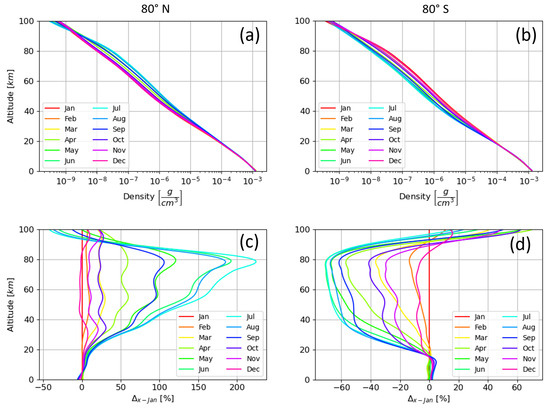 Seasonal variations of atmospheric density profiles at 80° N and 80° S as predicted by the NRLMSISE-00 model each month of 2014. Panels (a,c) respectively show the density profiles in and the relative difference between January and other month density profiles at 80° N. Same for panels (b,d) but at 80° S.
