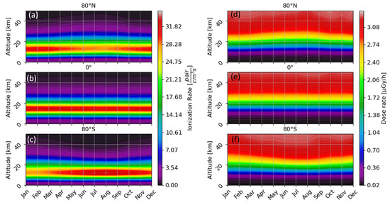 Seasonal variations in the GCR-induced ionization rate (left) and absorbed dose rate (right) in the atmosphere for 80° north for panels (a,d) and south for panels (c,f) as well as the equator for panels (b,e).