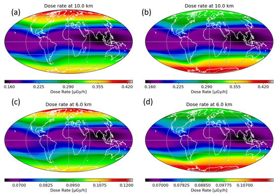 Global maps of the absorbed dose rate (in ) by a water ICRU sphere computed in January (left panels) and August (right panels) at fixed altitudes, 10 km (a,b) and 6 km (c,d). At a given altitude, the scale of the ionization rate is the same for January and August.