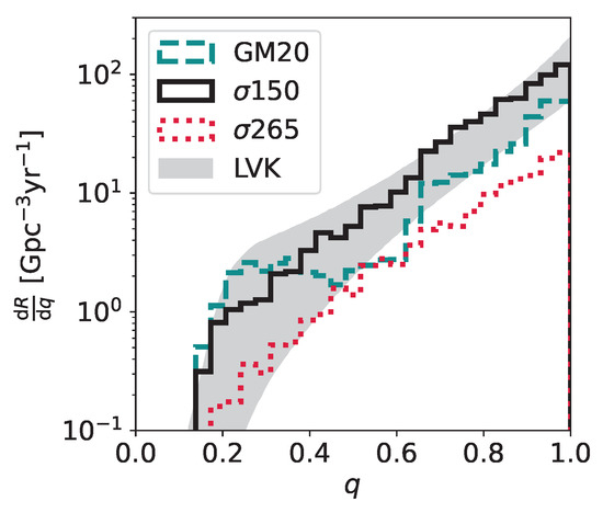 The primary BH mass (Figure 2) and mass ratio distributions (Figure 3) do not depend on the spin model, by construction. Therefore, we only show different natal kicks models in these figures. Models and show a similar distribution of primary masses with two peaks of similar importance, one at M and the other (broader) peak at M. In contrast, model GM20 has a dominant peak at M. The main reason for this difference is that the natal kick is independent of both BH mass and ejected mass in both models and [122]. Hence, binaries hosting low-mass BHs break up more easily during a supernova explosion in models and compared to model GM20. In contrast, most BHs receive low natal kicks in model GM20, and their binaries do not break.