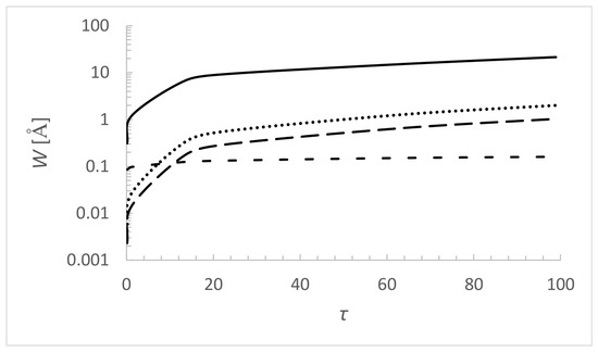 Dependence of Stark and Doppler full widths at half intensity maximum of N VI 3sS–3pPo, = 6993.0 Å spectral line (perturbers: electrons—solid line, protons—long dashes, He III—dots, Doppler—dashes), on the Rosseland optical depth in the atmosphere of a DO white dwarf. Model of white dwarf atmosphere [37] is with parameters = 60,000 K and log g = 8.