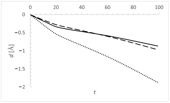 Dependence of Stark shift of N VI 3sS–3pPo, = 6993.0 spectral line Å (perturbers: electrons—solid line, protons—long dashes, He III—dots), on the Rosseland optical depth in the atmosphere of a DO white dwarf. Model of white dwarf atmosphere [37] is with parameters = 60,000 K and log g = 8.