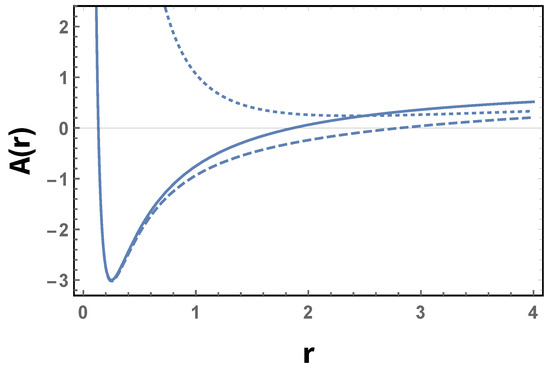 In all the cases discussed above, the presence of the cosmological term, constant or not, introduces new features in the solutions with respect to the usual Reissner–Nordström (RN) solution but does not remove the singularity at . The behavior of this class of solution is depicted in Figure 1 for some parameter values.