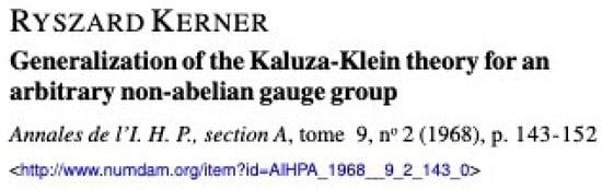 - Kerner, R. Generalization of the Kaluza-Klein Theory for an Arbitrary Nonabelian Gauge Group. Ann. Inst. H. Poincare Phys. Theor. 1968, 9, 143–152. [Google Scholar]