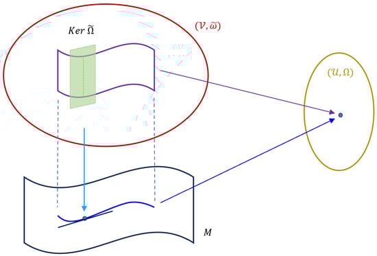 - The dynamics are discussed in terms of differential forms. The main tool is a 1-form on , whose exterior derivative is, in Souriau’s language, “presymplectic”, i.e., a closed 2-form that has a constant rank, dim . Then, the motions are the projections onto M of the integral submanifolds of the characteristic foliation of . Factoring out yields , the space of motions (an abstract substitute for phase space—Souriau’s “espace des mouvements” []). The presymplectic form projects onto as a symplectic form, i.e., one which is closed and has no kernel, as illustrated in Figure 2.