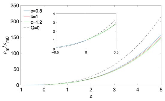 From Equation (17), the behavior of the dimensionless ratio in terms of redshift is shown in Figure 2. We observe that the energy density of matter is an increasing function of redshift z and remains positive as the universe expands for all the three values of c. Although the three cases of c deviate slightly at early times, they gradually decrease to zero at late time, as expected. This means that the universe exhibits the usual thermal history, with the successive sequence of matter and torsion epochs and with the transition to acceleration in agreement with the observational results. On the other hand, Figure 2 describes the effect of interaction Q on the energy density of matter. It is clear through the figure that the evolutionary trajectory of departs from the one of the non-interacting model, i.e., , at early times. The torsion model gradually closes to the non-interacting model, converges to it at the present time (i.e., ) and then slightly deviates from it at the late time, independent of c.