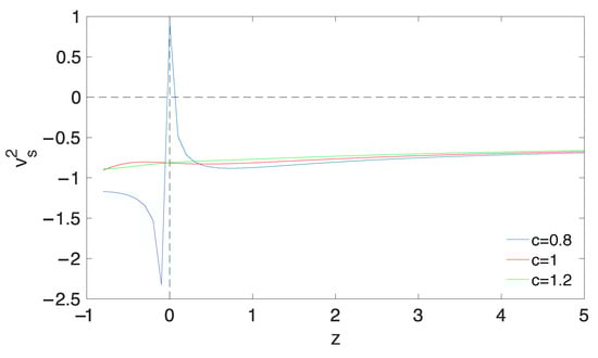 This parameter can be used to discuss how the stability of cosmological models is affected by its sign. If has a positive signature, the model is stable, while, for , the model is unstable. Utilizing Equations (21), (28) and (30), we can obtain the expression of for the reconstructed torsion model. Since the analytic expression of is rather cumbersome to exhibit, we shall limit ourselves to plotting it as in Figure 5. It is shown that, for the cases of , for all epoch and thus the torsion model is unstable against small perturbations during the cosmic evolution. Moreover, the evolutionary trajectories of change slowly and almost overlap. On the other hand, for the case of , it is clear that transiently occurs at , which shows that the model is classically stable at the current epoch. This means that the case of provides a more reasonable scenario to trace the cosmological evolution in the reconstructed torsion model.