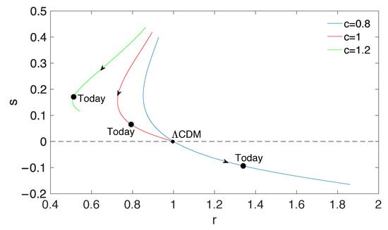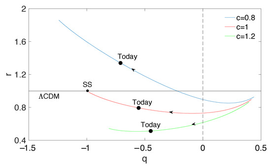 The parameter as a function of the deceleration parameter q. The arrows denote the evolution directions of and the dark line shows the time evolution of the CDM model. The stars on the curves indicate current states of the model for different values of c, and the point of corresponds to the steady state model (SS)—the de Sitter expansion.