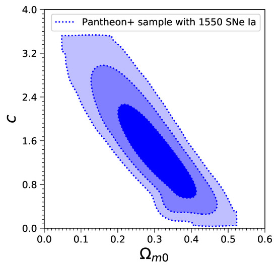The two-dimensional (2D) posterior distributions of the parameters ( are displayed in Figure 8 and Figure 9, corresponding to the constraints from the Pantheon and Pantheon+ samples, respectively. The mean values with 68% confidence limits for the parameters are and from the Pantheon sample and and from the Pantheon+ sample. One can see that the limits on are compatible with that of the CDM model obtained from the latest Planck mission observations at 68% confidence level [45]. In addition, the mean value of c from the Pantheon sample corresponds to the quintom-like scenario (i.e., ) and its mean value from the Pantheon+ sample corresponds to the quintessence-like scenario (i.e., ). However, both of the Pantheon and Pantheon+ samples cannot distinguish the quintom-like and quintessence-like scenarios at 68% confidence level.