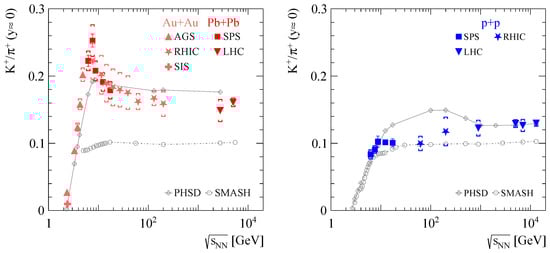 The richest experimental results on the collision energy dependence of hadron-production properties concern collisions between two heavy atomic nuclei, Pb+Pb and Au+Au collisions. Over the last 40 years, they were recorded in the hunt for QGP and the energy threshold of its creation—the onset of deconfinement. Many fixed-target and collider experiments in the US (Lawrence Berkeley Laboratory, LBL, and Brookhaven National Laboratory, BNL) and European (European Organization of Nuclear Research, CERN and Helmholtz Centre for Heavy Ion Research, GSI) laboratories have been conducting the measurements. The results are consistent with the onset of deconfinement being located at ( GeV) and the QGP being created at the early stage of heavy-ion collisions at higher collision energies (for review, see Refs. [2,3,4,5]). The most popular plot illustrating this assessment is presented in Figure 1 (left). It shows the collision energy dependence of the ratio in central heavy-ion collisions. The ratio shows the so-called horn structure. Following a fast rise, the ratio passes through a maximum in the CERN SPS energy range, at approximately 8 GeV, then decreases and settles to a plateau which continues up to the CERN LHC energies. Kaons are the lightest strange hadrons, and due to approximate isospin symmetry, the yield counts about half of the strange quarks produced in the collisions and contained in the reaction products [11]. Thus, Figure 1 (left) demonstrates that the fraction of strangeness carrying particles in the produced matter passes through a sharp maximum at the SPS energy range in central heavy-ion collisions; for a detailed explanation; see Ref. [4].
