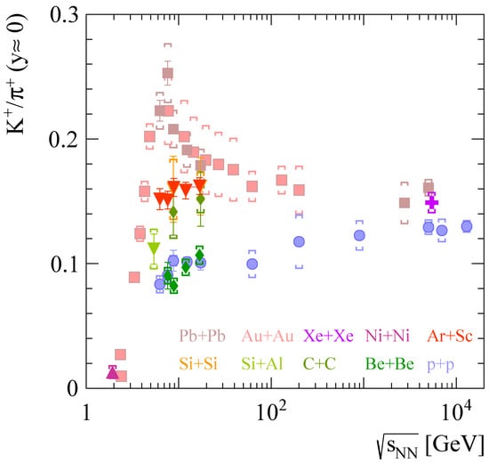 - Anticic, T.; et al. [NA49 Collaboration] System-size and centrality dependence of charged kaon and pion production in nucleus–nucleus collisions at 40A GeV and158A GeV beam energy. Phys. Rev. C 2012, 86, 054903. [Google Scholar] [CrossRef]