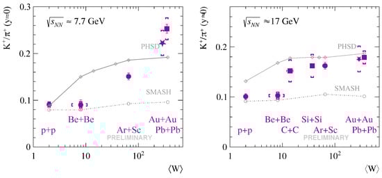 A different system-size dependence is predicted within statistical models of nucleus–nucleus collisions. The strangeness conservation imposed on the whole system leads to a fast increase of the ratio with increasing system size to its upper limit given by the grand-canonical-ensemble approximation. The effect is referred to as canonical strangeness suppression and has been extensively studied since 1980; see, e.g., Refs. [55,56,57]. The PHSD model predictions shown in Figure 3 show a gradual ratio increase with . However, in this model, the change is likely to be also caused by smoothly increasing contributions from QGP and chiral symmetry restoration. The PHSD model describes the main properties of the data significantly better. However, it fails to reproduce the jump between the results for p+p and Be+Be collisions and the results for heavier nuclei at GeV; see Figure 3 (right).