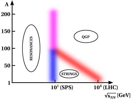 Schematic diagram of high-energy nuclear collisions outlined in colliding nuclei mass number, A, and collision energy, variables. Domains in which hadron production is dominated by the creation, evolution and decay of resonances, strings and quark–gluon plasma are indicated as resonances, strings and QGP, respectively, while thick coloured lines show the changeover regions between the domains.