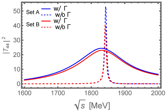 The blue dashed and solid lines are, respectively, the modulus squared of the T-matrix element, corresponding to the diagonal transition, evaluated with and without the inclusion of the widths associated with the axial-vector mesons taking part in the loop function (Equation (20)).