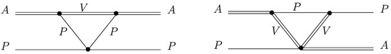 with and the masses of the pseudoscalar and axial-vector mesons, respectively, involved in the loop in the channel l, and P the total four-momentum of those mesons (). After the integration over the temporal component , Equation (20) becomes