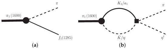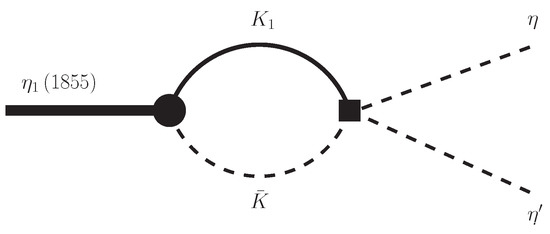 Let us first discuss the decay, whose Feynman diagram is shown in Figure 3. Within our approach the structure decays via its component, with the corresponding coupling constant listed in Table 10. We also need to evaluate the transition, for which we use the resonance chiral theory (RT) operators given in Ref. [45].