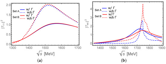 Alternatively, following the prescription used in Section 3, we can also study the changes in the results caused by the inclusion of the finite widths for the axial-vector mesons by looking at the line shape for the relevant T-matrix elements. In Figure 5a, we show the line shapes for the T-matrix element corresponding to the elastic transition, which is the one we would expect the lower pole in Table 11 manifests most due to its large coupling to the channel. It becomes clear that the bumps become broader when the widths of axial-vector mesons are taken into account. A similar behavior can be seen in Figure 5b for the T-matrix element associated with the scattering of , which is the channel to which the higher pole couples most strongly. The peak mass and width extracted from the line shape of the diagonal T-matrix element for the dominantly coupled channel are also listed in Table 11 when the axial-vector meson widths are considered.