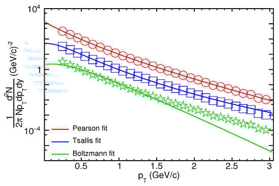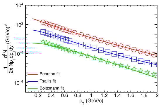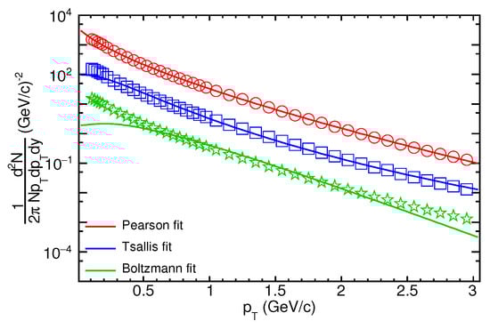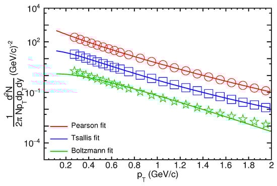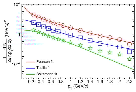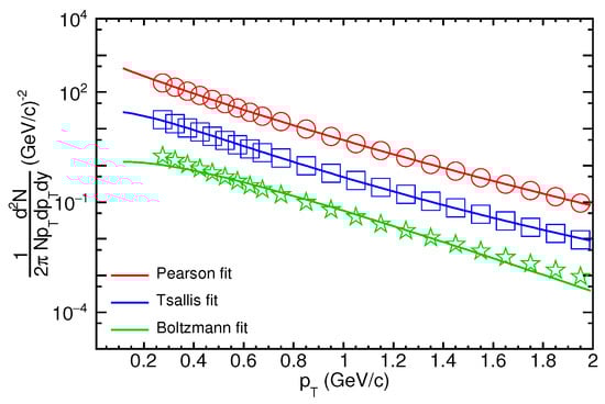 where and n are fitting parameters and A is the normalization constant related to free parameters. This QCD-inspired model was proposed by Hagedorn [42] to describe the data of an invariant cross-section of hadrons as a function of . Our proposal to the question above stated is to combine inverse power-law and Tsallis distribution using Pearson distribution. This statistical approach is discussed in detail in the following sections.