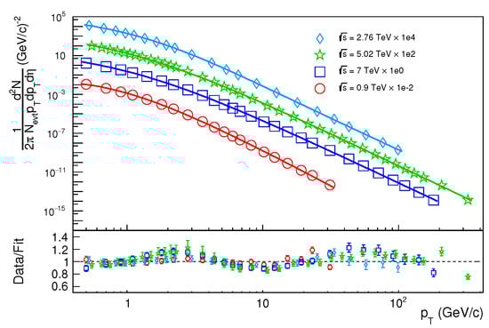 Top plot: The transverse momentum data of charged hadrons produced in pp collision at TeV [53], TeV [54], TeV [55], and 7 TeV [53] measured by the CMS experiment fitted with unified distribution Equation (43). Bottom plot: Ratio of the experimental data to the corresponding value obtained from the fit function.