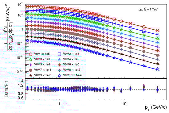 Top plot: The transverse momentum data of charged hadrons divided into multiplicity classes produced in pp collision at 7 TeV [56] measured by the ALICE experiment fitted with unified distribution Equation (43). Bottom plot: Ratio of the experimental data to the corresponding value obtained from the fit function.