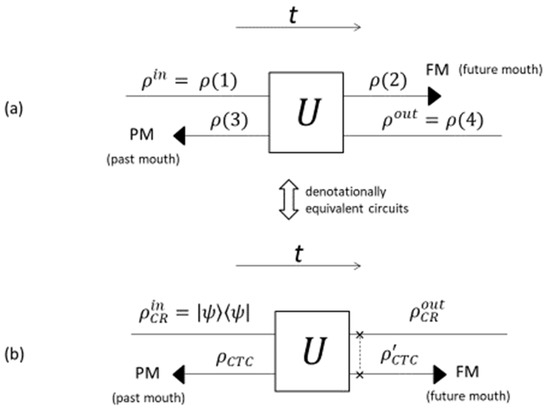 The circuit represented in the Figure 1a can be conveniently transformed into a simpler denotationally equivalent circuit [24], as shown Figure 1b, for which the outputs of the transformed circuit are the same function of the inputs as in the original circuit, as defined by Deutsch [24], by including a gate after the original gate , so that the interaction in the transformed circuit is given by . In this way the one-particle circuit is replaced with an equivalent two-particle circuit [26,50] constituted by a chronology-respecting particle (CR) that interacts with another particle confined in a closed timelike curve (CTC). Now, the consistent condition in this equivalent circuit, shown in Figure 1b, is obtained by requiring that the quantum state () of the chronology-violating particle that emerges from the past mouth of the wormhole in the closed timelike curve be the same as the state that enters the future mouth ():