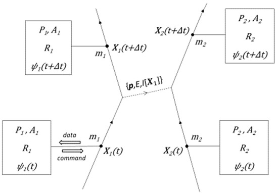 Bearing this in mind, we characterize in DAQM [37,38,39,40,41,42] a fundamental physical system as a particle of mass and position in physical space (see Figure 2). Every particle is methodologically supplemented with a classical Turing machine defined on an information space where a program , which includes an anticipation module or subroutine , and a random number generator7 are also stored. At every run of the program, a carrier of energy () and momentum () is emitted by the particle according to the output calculated by the algorithm . Particles interact absorbing and emitting these carriers that also transport information () about the emitter to the absorber. This information consists in positions of systems. In this framework, the wave function can be considered as a book-keeping tool that appropriately codes the data about the surrounding systems so that the program may calculate efficiently the self-interaction, i.e., the corresponding parameters of the carrier to be emitted. In physical space, particles follow continuous trajectories and comply with the conservation of energy and momentum.
