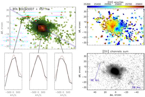 There are different estimations of current AGN outflow velocities in the region of 10–12 kpc radio bubbles, spanning the range of [,,]. If we accepted a conservative estimation according to the [O iii] residual velocity map (Section 5), then the dynamical age of the NE and SW arcs is <0.8 Gyr. This value seems to be in good agreement with the age of a central star formation and minor/moderate merging. Therefore, our estimation does not contradict the fact that the most distant emission arcs around the Teacup galaxy are related with the first QSO activity episode triggered by galactic interaction, which also started a central burst of star formation. Moreover, it is possible that a circumnuclear starburst also contributed to the formation of the external emission arcs via a galactic wind (see the paper by López-Cobá et al. [] for a review and observational examples). A more deep study of the external gas ionization properties and its kinematics (including the velocity dispersion distribution) are needed to separate the possible influence of AGN and starburst-driven wind and radio jet action on a formation of the emission arcs.