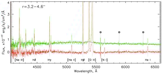 The observed long-slit spectra contain a combination of the ionized gas emission and stellar absorption lines. We used the penalized pixel-fitting (pPXF) method to fit a stellar population spectrum [], using MILES stellar spectral library by Vazdekis et al. [] covering the range 3525–7500 Å with a twice higher spectral resolution than in the SCORPIO-2 data. In order to improve the signal-to-noise ratio, the spectra used for the pPXF analysis were binned along the slit using the step exponentially increasing with radius: from 2 px () bins in the nucleus up to 10 px () at the distances from the center. An example of the observed Teacup spectrum fitted by pPXF model is shown in Figure 2.